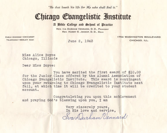 In 1910, Dr. Iva Durham Vennard founded Chicago Evangelistic Institute (CEI) in Chicago, Illinois, for the purpose of providing "effective training for Christian service." Her stated goals were to send Spirit-filled people into the ministry and to promote Scriptural Holiness. |